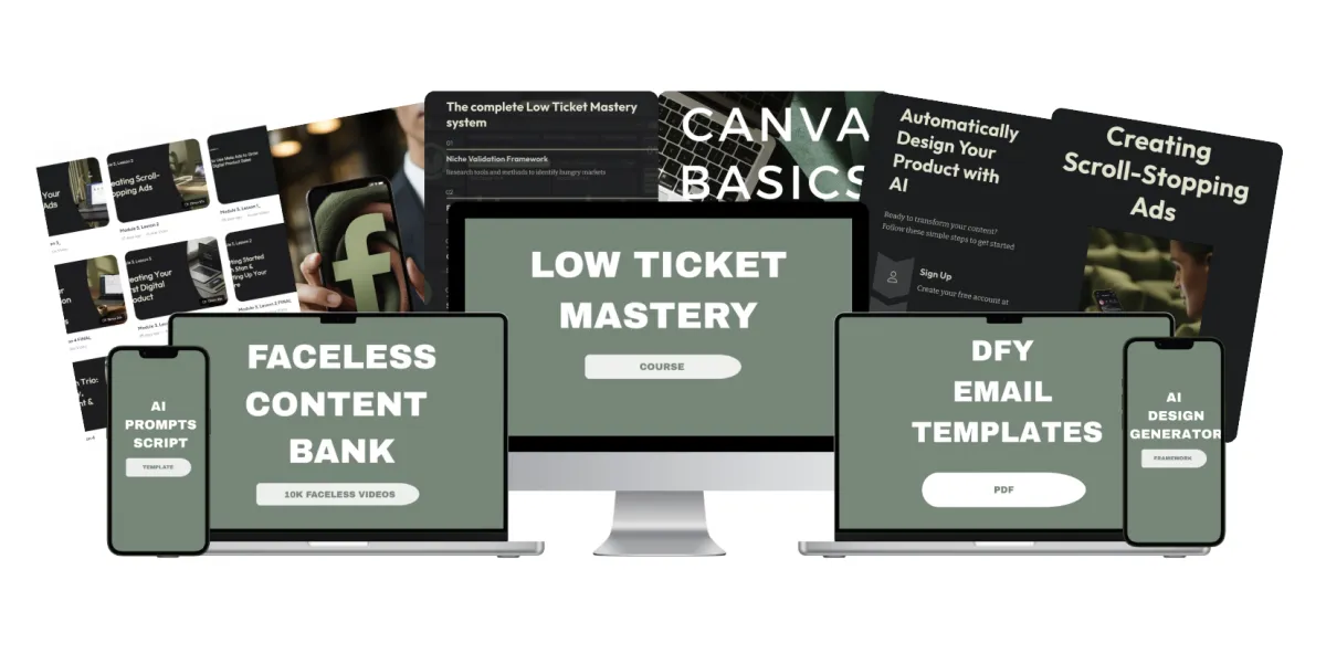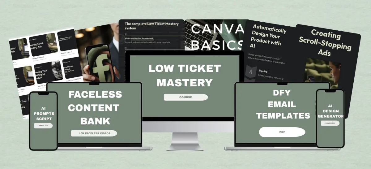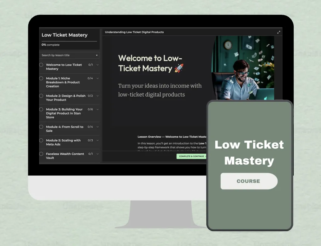 Low Ticket Mastery is a complete system that shows you how to create and scale simple, in-demand digital products (like PDFs) — without needing an audience, showing your face, or using complex tools. Throughout this course, you’ll learn how to find what sells, create with speed leveraging AI, and start generating daily passive sales — all from your phone.