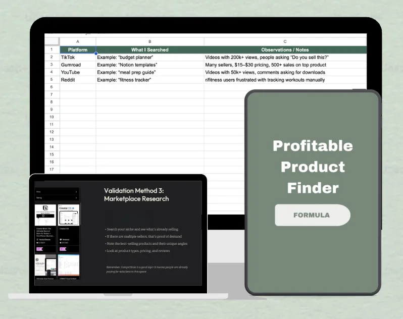 Using my proven prompts, you’ll quickly uncover what people are already buying — so you can choose an idea with real demand behind it. You’ll also get my Profit Discovery Sheet to map out your best ideas… along with a simple validation method to confirm you’ve got a winner before you ever create it.